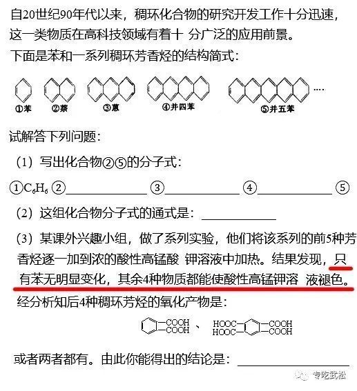 這題的結論當然是苯很穩定,不與濃、熱的高錳酸鉀酸性溶液反應。而不能說苯環很穩定,不與高錳酸鉀酸性溶液反應,但苯環畢竟是具有穩定性的,所以注意觀察上題中的反應條件:濃、熱,不要離開反應條件談反應。