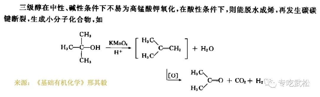 酸性條件下,叔醇易發生消除反應(即人教版中的消去反應),生成烯烴,再被氧化成羧酸、酮、二氧化碳、水等小分子物質。叔醇的反應,雖然小朋友們很容易就能弄懂,但也不必過多研究。這里提醒一下,不要輕信百度公司和百度搜索結果。