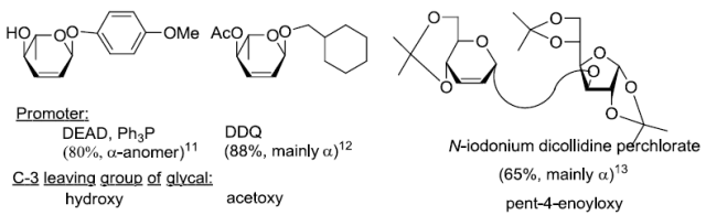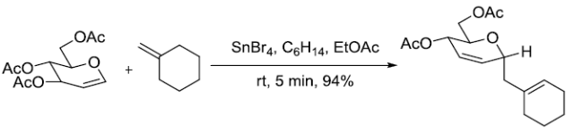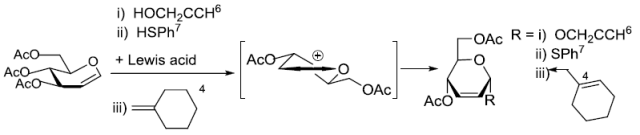 在Lewis酸存在下,O-取代的烯糖衍生物可與O-、S-、C-或較少見到的N-、P-和鹵化物等親核物種反應(yīng)給出2,3-不飽和糖基產(chǎn)物。這個(gè)烯丙基轉(zhuǎn)移已被稱為Ferrier反應(yīng),或?yàn)楸苊饣靵y而稱“FerrierⅠ反應(yīng)”或“Ferrier重排反應(yīng)”。但該反應(yīng)實(shí)際上是費(fèi)歇爾在水相中加熱三O-乙酰基-D-己烯糖時(shí)所發(fā)現(xiàn)的。當(dāng)反應(yīng)涉及碳親核物種時(shí)已俗稱“碳Ferrier反應(yīng)”,盡管Ferrier小組在這個(gè)領(lǐng)域只是發(fā)現(xiàn)了三O-乙酰基-D-己烯糖在酸催化下二聚給出C-配糖產(chǎn)物的反應(yīng)。通用的反應(yīng)可以用O-乙酰基-D-己烯糖分別與O-、S-、C-親核物種反應(yīng)給出相應(yīng)的2,3-不飽和糖基產(chǎn)物來(lái)表示。Lewis酸通常被用作催化劑,BF3是最常用的。中間體產(chǎn)物是烯丙氧基碳負(fù)離子,配糖產(chǎn)物的產(chǎn)率很高且以假a-鍵為主(通常,α,β-之比為7:1)。給出的實(shí)例是大量文獻(xiàn)報(bào)道中的典型。