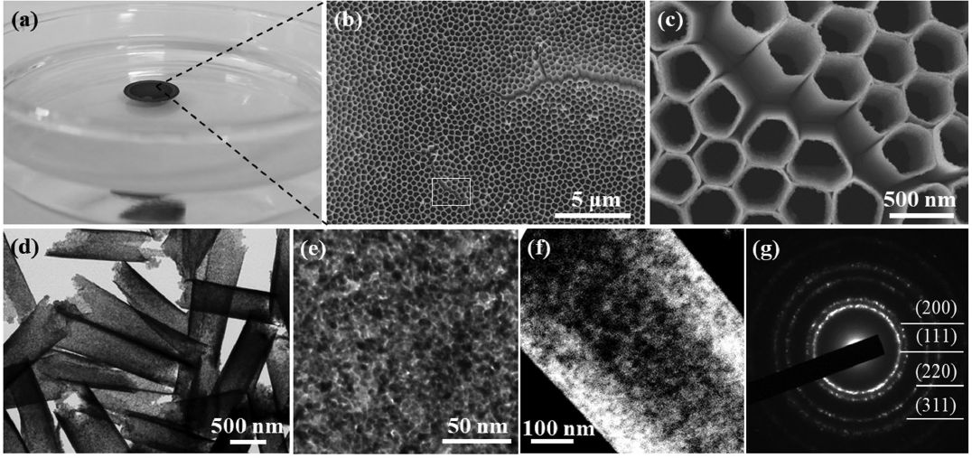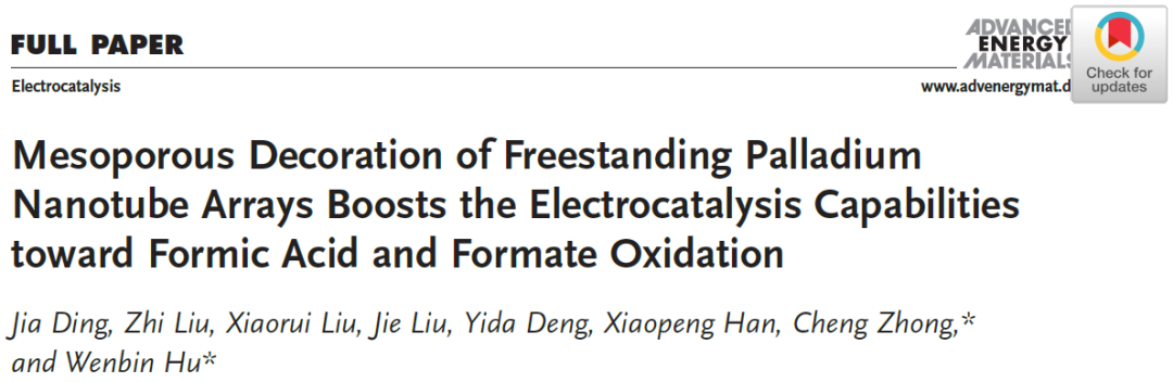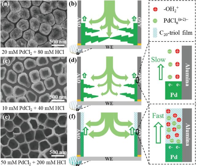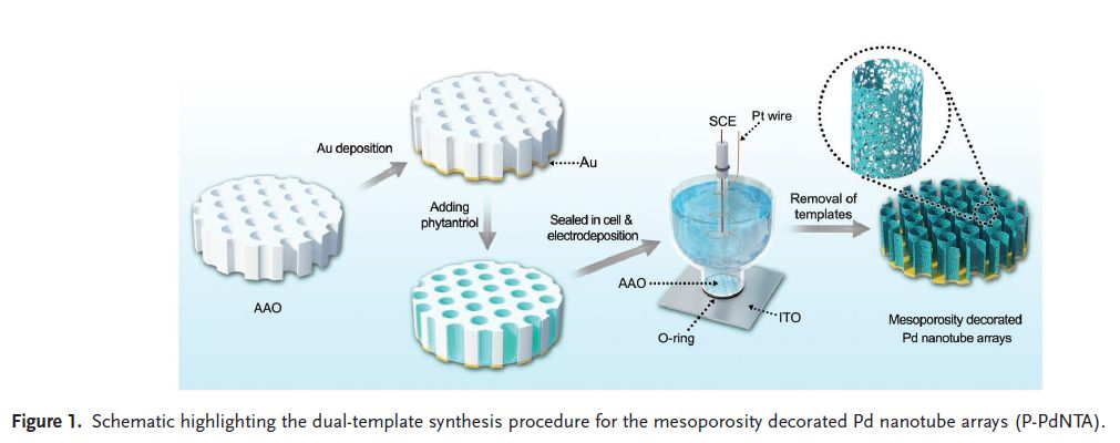近日,天津大學(xué)胡文彬、鐘澄團隊提出了一種“基于有機-無機雙模板的電化學(xué)沉積”策略,制備得到介孔修飾的自支撐鈀納米管陣列催化劑(P-PdNTA)。制備高性能電催化劑是將甲酸或甲酸燃料電池商業(yè)化的最關(guān)鍵步驟。在這項工作中,使用雙模板電沉積方法來創(chuàng)建獨立的介孔裝飾鈀納米管陣列(P-PdNTA),作為對甲酸和甲酸氧化(FAO / FOR)的雙功能電催化劑。基于植物三醇的軟模板可改變鋁陽極氧化物內(nèi)部的表面化學(xué)表面,從而促進高度穩(wěn)定的鈀納米管的受控電沉積。