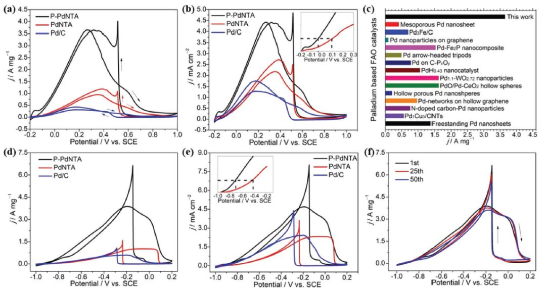 犧牲軟模板會在納米管上產(chǎn)生大量的介孔,相對于無介孔的PdNTA基線,其電化學(xué)活性表面積增加了189%。此外,軟模板通過擾動常規(guī)納米管的生長顯著增加了單位面積催化活性位點的密度,這是P-PdNTA與PdNTA的面積催化活性翻了一番所證明的。值得注意的是,P-PdNTA對FAO和FOR的重量催化電流分別為3.65和3.87 A mg-1,分別比商業(yè)Pt / C高8.5和6.5倍。這些值是最令人鼓舞的報告之一,它們得益于快速的物質(zhì)傳輸,大的電化學(xué)活性表面積和高催化活性位點的面積的獨特協(xié)同作用。