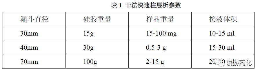 需要的設備很簡單,就是把減壓抽濾所用的圓柱形多孔漏斗,通過一個錐形插口轉換頭連接到一個圓底燒瓶上,另外側邊的一個插口連接到水泵(圖1)。要純化的樣品量決定了使用的漏斗的大小和洗脫液的接收體積。具體建議參見表1。