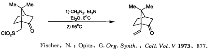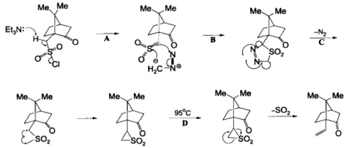 反應實例反應說明:該反應是Ramberg-Backlund反應反應機理A:形成磺烯B:重氮甲烷與磺烯進行1,3-偶極環化C:脫掉一分子氮氣形成環乙砜D:發生Ramberg-Backlund反應脫掉一分子二氧化硫得到產物