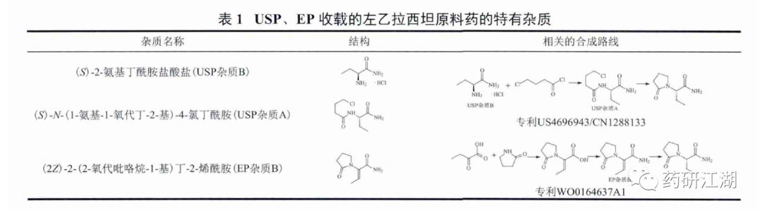 藥典等文獻也是雜質譜分析的重要參考,可參考文獻中報道的同品種或相同結構類型藥物的雜質信息。但需要注意的是,由于合成路線可能不同,不建議簡單套用文獻報道的工藝雜質,需要結合自擬的合成工藝分析是否可能產生與文獻報道一致的雜質。例如,因合成工藝不同,USP38、EP8.0的左乙拉西坦原料藥標準中收載了不同的特定工藝雜質,(S)-2-氨基丁酰胺鹽酸鹽(USP雜質B)和(S)-N-(1-氨基-1-氧代丁-2-基)-4-氯丁酰胺(USP雜質A)是USP收載的特有雜質,(2Z)-2-(2-氧代吡咯烷-1-基)丁-2-烯酰胺(EP雜質B)是EP收載的特有雜質,分別產生于不同的合成路線(表1);毒性雜質2-羥基吡啶(EP雜質C)雖然在USP38、EP8.0中均有收載,也建議結合自擬制備工藝(是否使用該合成試劑)考慮是否需要作為特定雜質進行研究。