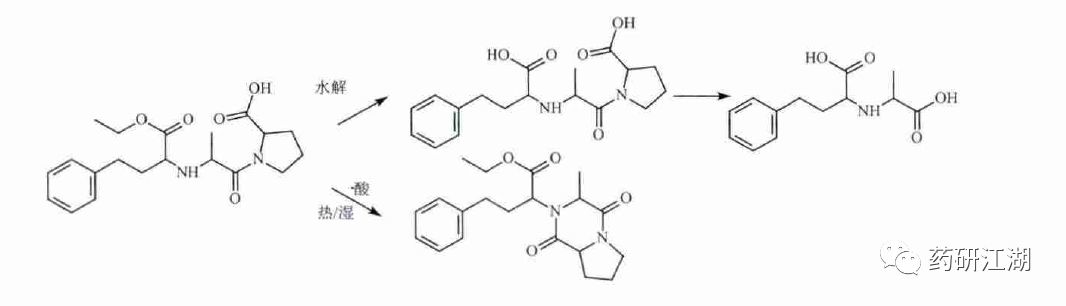 仍以依那普利為例進行說明(圖4),通過溶液以及固體狀態下的降解試驗,依那普利的主要降解途徑是水解降解,在酸堿條件下首先是酯鍵的水解,如果條件劇烈,還可能進一步產生酰胺鍵的水解產物;在酸水解、固體濕熱條件下還可見形成內酰胺環合的降解產物。