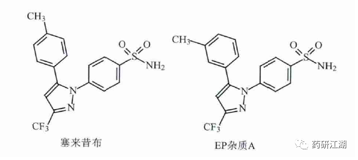 建議重點關注那些可引入后續反應的潛在雜質,通常這類雜質的結構與主成分類似,可隨主成分一同進行后續的化學反應,且理化性質也可能與主成分比較接近,后續工藝步驟對其清除能力相對其他雜質來說比較有限,在終產品中殘留的可能性也較大,這類雜質也多見用于有關物質檢查方法系統適用性的分離度規定。例如,EP8.0收載塞來昔布標準中的雜質A就是合成原料引入的苯環間位甲基異構體雜質(圖2)隨主成分一同進行后續反應而產生的工藝雜質,因其結構和性質與主成分非常接近,比較難以清除,不僅作為特定雜質規定限度0.4%,還在系統適用性中規定主成分峰與雜質A峰的分離度不低于1.8。