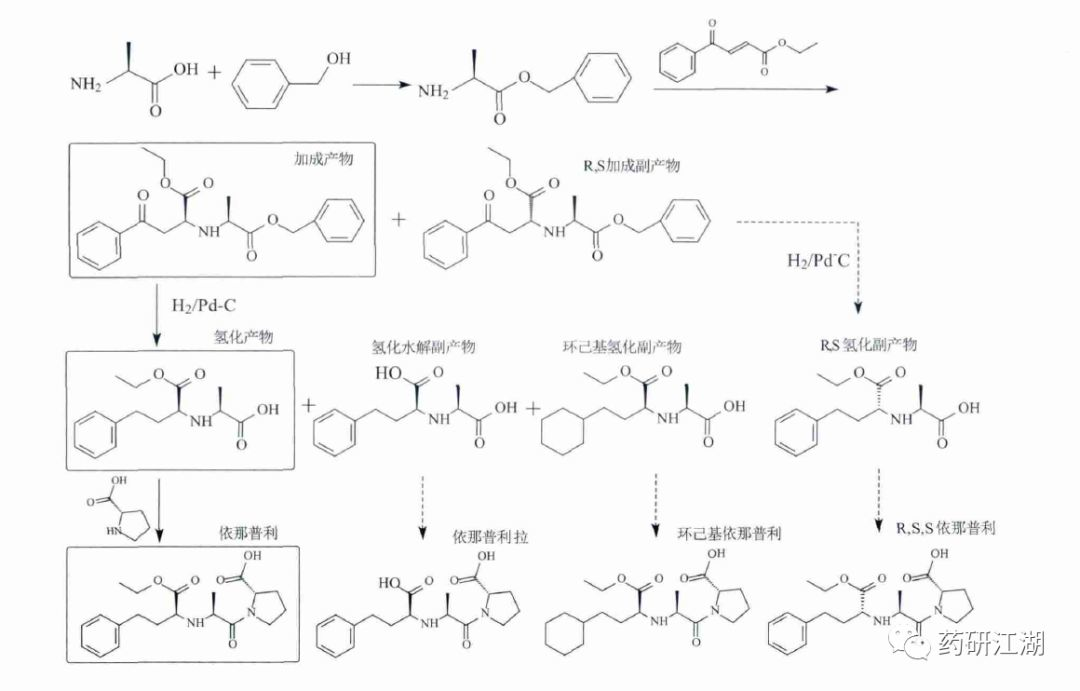 以馬來酸依那普利為例進行說明,簡略合成路線見圖3,以L-丙氨酸為原料,經酯化、加成、催化氫化、成酰胺等多步反應制備馬來酸依那普利原料藥。其結構中含有3個手性中心,第2個手性中心是在加成反應中引入,通過溶解性的差異可分離、去除該步驟產生的非對映異構體雜質RS加成副產物,但是少量殘留的該副產物雜質可繼續參與后續的氫化、酰化反應,最終生成終產品的RSS異構體雜質。此外,在Pd/C催化氫化步驟中,可能發生乙酯水解、苯環氫化的副反應,這些副反應雜質均可參與下一步的?;磻罱K生成工藝雜質依那普利拉、環己基依那普利。以上工藝副產物雜質產生的可能性較高,還需要終產品質量標準的控制,EP8.0收載的馬來酸依那普利原料藥標準中RSS異構體雜質(EP雜質A,限度1.0%)、依那普利拉(EP雜質C,限度0.3%)、環己基依那普利(EP雜質H,限度0.3%)均作為特定雜質進行了質控,系統適用性中還規定了RSS異構體雜質(EP雜質A)與主峰的分離度。