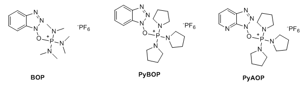 另一類為鏻鎓鹽,最早的為苯并三氮唑-1-基氧-三(二甲胺基)鏻鎓六氟磷酸鹽(BOP)試劑,該試劑由于產(chǎn)生致癌的六甲基磷酰胺(HMPA)副產(chǎn)物,因而近年來被活性更好的,不產(chǎn)生致癌的副產(chǎn)物的苯并三氮唑-1-基氧-三(四氫吡咯基)鏻鎓六氟磷酸鹽(PyBOP)所代替。