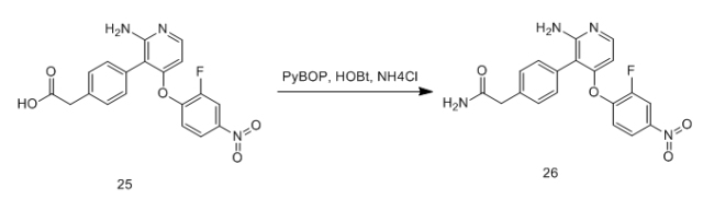 A solution of2-(4-(2-amino-4-(2-fluoro-4-nitrophenoxy)pyridin-3-yl)phenyl)acetic acid (65mg, 0.17 mmol) in anhydrous DMF (1.2 mL) was treated with PyBOP (125 mg, 0.24mmol) and HOBt (32 mg, 0.24 mmol) followed by DIPEA (60 mL, 0.35 mmol) and NH4Cl(19 mg, 0.35 mmol). After stirring atroom temperature for 20 min, the mixture was concentrated under vacuum and theresidue partitioned between EtOAc and saturated aq. NaHCO3 solution. The EtOAc phase was washed with brine, dried(MgSO4) and concentrated in vacuo. The product was purified by flash column chromatography on SiO2 elutingwith 0-8% of MeOH/CH2Cl2 to give the title compound 26 (40 mg, 62percent) as an ambercolored oil. 1H NMR (DMSO-d6) d 8.23 (dd, 1H, J=10.7, 2.5Hz), 8.05 (d, 1H, J=9.2 Hz), 7.93 (d, 1H, J=6.1 Hz), 7.42-7.32 (m, 2H),7.33-7.25 (m, 4H), 6.92 (s, 1H), 6.25 (d, 1H, J=5.6 Hz), 5.64 (s, 2H), 3.36 (s,2H); MS (ESI+): m/z 383.17 (M+H)+.