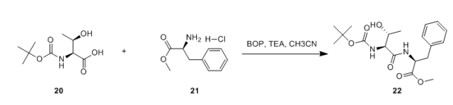 A solution of tert-butyloxycarbonyl threonine 20 (2.19 g,10 mmol) and phenylalanine methyl ester hydrochloride 21 (2.16 g,10 mmol) in 150 mL CH3CN is stirred at R.T. while the BOP-reagent (4.42 g, 10 mmol) is added, followed bythe addition of triethylamine (2.2 g,2.8 mL, 20 mmol). The reaction isstirred at R.T. for 1.5 hr. 100 mL of asaturated NaCl solution is added and the product extracted with EtOAc. The combined organics are washed with 2NHCl, H2O, 5% NaHCO3, and then H2O. The organics are dried over MgSO4, filtered, and concentrated in vacuo to give the dipeptide (3.74g, 98%).