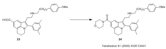 Morpholine(0.17 mL, 0.58 mmol) and PyBOP (0.56 g, 0.32 mmol) were added to the solutionof N-methylmorpholine (0.22 mL, 0.58mmol) and carboxylic acid 23(0.50 g, 0.29 mmol) in dimethylformamide (5mL). The mixture was stirred at roomtemperature for 3 days. The mixture was quenchedwith water and the aqueous solution was extracted with dichloromethane. The organic layer was washed with water, driedover Na2SO4 and concentrated in vacuo. The crude product was purified by silica gelcolumn chromatography eluting with dichloromethane/ethanol (9/1) to give morpholide24 as a white solid (109 mg, 65%). Mp 92–94℃.