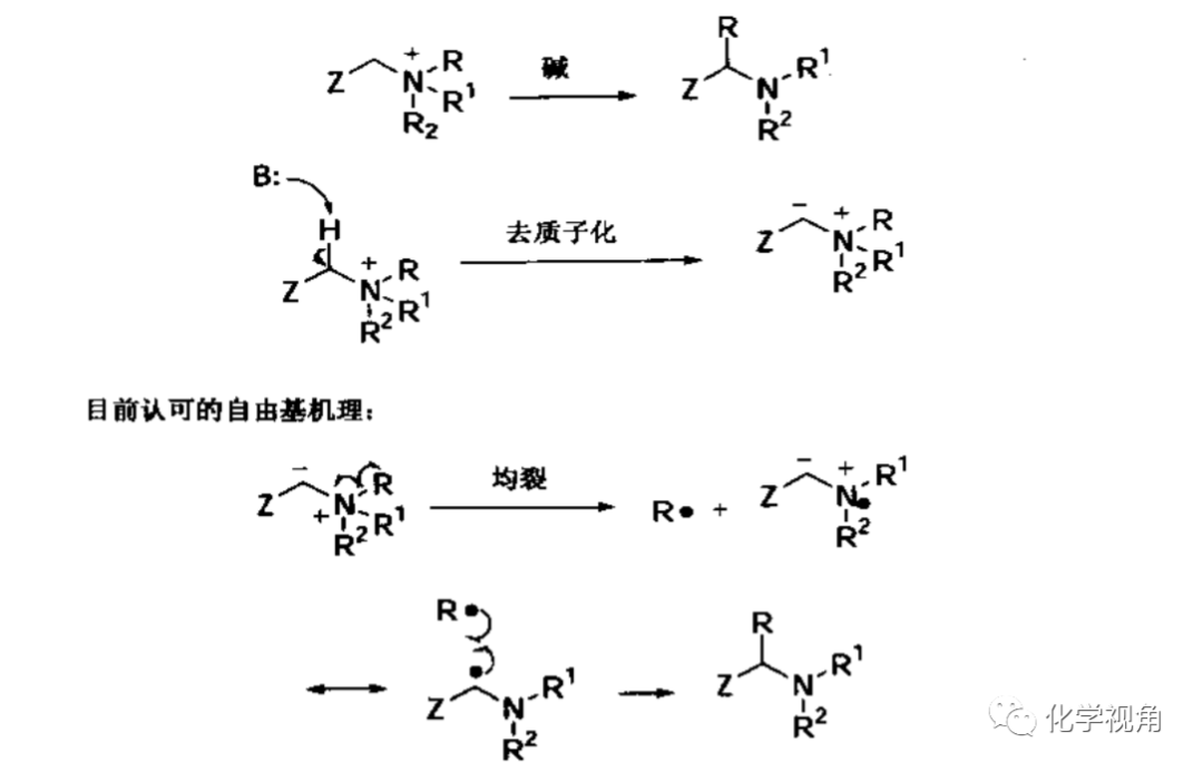 一個吸電子基團接在和氮相連的碳原子上的季銨鹽用強堿處理,得到重排的叔胺.