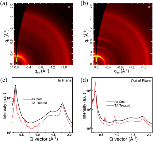 ▲圖6. SM1-F:Y6共混薄膜后處理前(a)和退火后(b)GIWAXS圖像