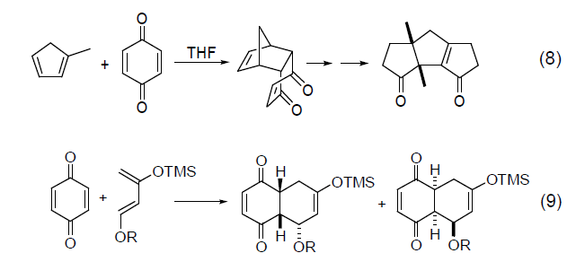 1,4-苯醌的另一類重要反應是作為親二烯試劑。因為羰基的吸電子效應,所以1,4-苯醌是很好的親電試劑,在電負性的二烯底物存在下可以很容易實現Diels-Alder反應。很典型的一個例子就是在Capnellene 試劑的全合成中1,4-苯醌與1-甲基-1,3-環戊二烯的Diels-Alder反應為最終產物提供了很好的反應前體 (式8)[8]。此外,1,4-苯醌參與的不對稱Diels-Alder反應也有諸多報道 (式9)[9]。
