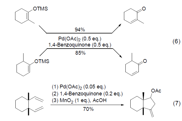 此外,1,4-苯醌和醋酸鈀氧化體系還能實現甲基硅烷烯醇醚向共軛烯酮的轉換,反應具有非常好的區域選擇性和立體選擇性 (式6)[6]。結合1 份量的氧化錳試劑,0.05 份量醋酸鈀和0.2 份量1,4-苯醌還能實現1,5-己二烯
