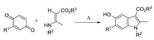 對苯醌和β-胺基巴豆酸酯縮合得到5-羥基吲哚的反應。