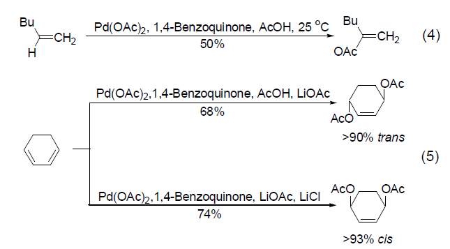 1,4-苯醌的代表性用途是作為醋酸鈀催化反應的共氧化劑,將還原消除后產生的Pd(0)重新氧化為Pd(II)進入催化循環。如0.1倍量醋酸鈀和1 倍量1,4-苯醌實現的烯烴與醋酸的氧化偶聯反應 (式4)[4]。1,4-苯醌和醋酸鈀氧化體系還能較高產率地實現1,3-環己烯向1,4-乙酰氧基-2-環己烯的轉化 (式5)[5],反應的產物會受到其它加合物的影響,如在醋酸鋰存在下,反應的主要產物是反式的二乙酰氧基化合物;而在醋酸鋰和氯化鋰共同存在下,反應的主要產物則是順式的二乙酰氧基化合物。