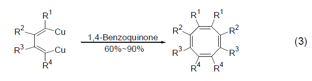 烯基銅化合物,在1,4-苯醌存在下氧化劑偶聯,生成共軛二烯化合物,如二烯基二銅化合物,加入1,4-苯醌進行自偶聯反應,成功地制備了環辛四烯衍生物 (式3)[3]。