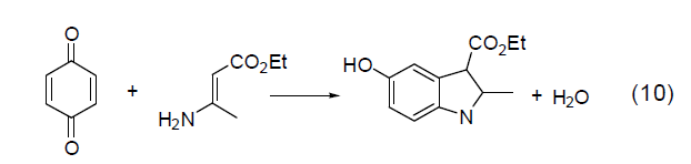 值得強調的是,1,4-苯醌的另外一個重要用途是用于5-羥基吲哚衍生物的合成(式10)[10]。反應非常簡單,底物的選擇性也很廣。