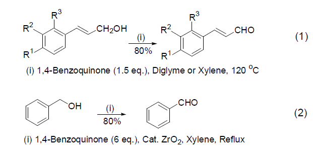 1,4-苯醌是一種常用的氧化試劑或脫氫試劑,因為它很容易被其它化合物還原為對苯二酚,從而能表現出氧化活性。并且其自身的氧化電位決定了1,4-苯醌能夠在多種醇化合物共存的情況下選擇性地氧化共軛的一級烯丙醇,如在二級醇和芐醇共存情況下選擇性地將肉桂醇氧化為肉桂醛 (式1)[1]。此外,采用1,4-苯醌作為脫氫試劑和水合氧化鋯作為催化劑還能實現一級醇的氧化反應 (式2)[2]。