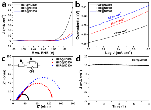 圖譜表明所包覆的納米顆粒為Ni單質(圖3 (d))。分析其衍射條紋可以看出,核心部分晶格間距約為0.2 nm的條紋對應Ni單質中的(111)晶面,而周圍包覆的晶格間距約為0.34 nm的條紋則對應碳單質中的(002)晶面,清晰地驗證了材料中Ni@碳核-殼結構的形成。▲圖4不同形貌的MOF前驅體衍生的N摻雜的Ni@C復合納米催化劑的OER性能對比。(a) 掃速5 mV/s下的LSV曲線;(b) Tafel曲線;(c) EIS曲線及對應的模擬電路;(d) 以石墨片為基底測得的HXP@NC800的i-t曲線。