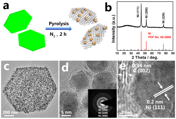 MOF六角片的成功合成意味著吡啶在抑制MOF晶體生長方面具有明顯的效果。而吡啶具體作用的位置以及機制則需要通過觀察在控制吡啶相對濃度的情況下MOF晶體形貌的改變來進行驗證。因此,我們在不改變其他條件的情況下,逐步減少吡啶的用量至原濃度的2/3和1/3,得到了厚度在100 nm左右的納米六角盤(HXD)和長度在 800 nm左右的納米六棱柱(HXR)(圖2)。從SEM中可以發(fā)現(xiàn),HXD和HXR的橫向尺寸都維持在600~800 nm,與HXP完全一致。這意味著吡啶含量的改變對MOF框架面內(nèi)的配位沒有產(chǎn)生明顯的影響。從圖 1中對MOF框架結構的分析來看,面內(nèi)的配位原子為羧基上的氧原子,它與Ni2+的結合能力較強,因此難以受到吡啶的影響。而層間的DABCO分子通過N原子配位,當晶體周圍吡啶的濃度上升時,DABCO分子則會被吡啶所替代,從而導致了晶體厚度(長度)的變化。通過這種面內(nèi)/層間配位模式的分離,加以對MOF晶體截面形貌和尺寸的控制,我們提出了這一“替代-抑制”過程,錨定了吡啶的作用位置,為單齒配體抑制劑作用機理的研究提供了更進一步的視點。▲圖2 (a,b) HXD不同倍率下的掃描圖片;(b,c) HXR不同倍率下的掃描圖片。MOF材料作為前驅體可以經(jīng)由簡單的熱處理過程得到含有N原子摻雜的金屬@碳復合材料。我們首先研究了HXP在氮氣保護下800℃熱處理所得到的產(chǎn)物HXP@NC800。如圖3 (a)所示,熱處理過程中框架結構中的有機配體會逐漸分解,同時還原Ni2+離子,形成碳層包覆的Ni@碳復合結構。從圖3 (b)中HXP@NC800的衍射圖譜可以得到,催化劑的物相主要為Ni單質。通過TEM表征其形貌可以發(fā)現(xiàn),六角片的形貌可以完整地保持下來,但其表面變得粗糙,有大量納米顆粒鑲嵌在碳基底上(圖3 (c))。高倍TEM圖像和對應的SEAD衍射▲圖3 納米催化劑HXP@NC800的 (a) 合成示意圖;(b) XRD圖譜;(c) 低倍TEM圖像;(d) 高倍TEM圖像及插圖中的SEAD衍射圖譜;(e) 高分辨TEM圖像及衍射條紋。