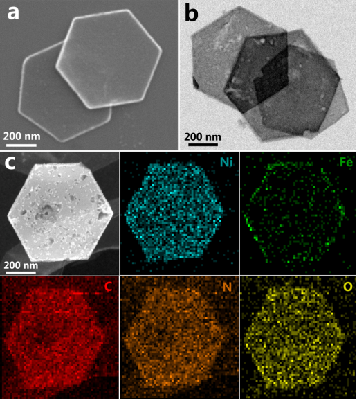 為了研究厚度控制對催化劑性能的影響,我們對同時對HXD和HXR在氮氣保護下進行了熱處理,得到的催化劑HXD@NC800和HXR@NC800與HXP@NC800在1 M KOH溶液中催化析氧反應的性能如圖4所示。可以看出HXP@NC800在達到10 mA cm-2時所需電流密度最低(307 mV),對應的Tafel斜率最小(48 mV dec-1)。從EIS曲線中可以得出HXP@NC800具有最低的阻抗值,意味著其電荷傳輸?shù)男阅鼙菻XD@NC800和HXR@NC800要高。我們進一步測量了催化劑在非活性區(qū)間的氧化還原曲線,通過對的Cdl值的估算發(fā)現(xiàn)材料的活性面積隨著厚度的減少而增大,意味著縱寬比的提升能夠在材料表面暴露出更多的活性位點,從而使得材料的活性得到明顯的提升。▲圖5 Fe摻雜的HXP的 (a) SEM圖片; (b) TEM圖片; (c) EDS mapping圖片。