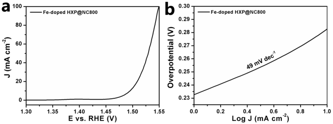 我們進一步研究了Fe的摻雜對催化劑性能的影響。以HXP為基底,通過簡單的物理吸附將Fe2+離子摻入到MOF孔道中。從圖5中可以看出,摻雜后的納米片形貌沒有發(fā)生明顯的改變,Ni、Fe、C、N和O五種元素在納米片中均勻分布,沒有出現(xiàn)明顯的團聚或者斷裂的現(xiàn)象。之后在氮氣保護下800℃熱處理得到Fe摻雜的HXP@NC800納米催化劑,其OER性能得到進一步的提升,達到電流密度10 mA cm-2時過電位可低至266 mV(圖6)。▲圖6 Fe摻雜的HXP@NC800納米催化劑的 (a) LSV曲線; (b) Tafel曲線。
