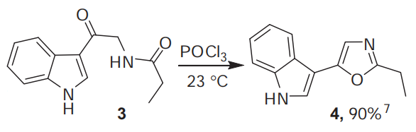 3-(2-Ethyloxazol-5-yl)-1H-indole (4). 3 (0.1 g, 0.43 mmol) in 5 mL POCl3 was stirred 18 h (r.t.),evaporated, and the residue in 50 mL EA washed (NaHCO3). Workup afforded, 82 mg, 90% of 4,mp 161–163 ℃.