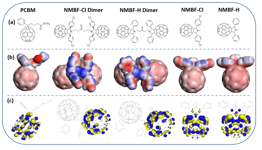 課題組設計合成了一系列基于C60的新型吡咯烷類富勒烯(NMBF-X,X=H或Cl)單分子和二聚體(Figure 1),電子能級顯示其適合作為界面修飾材料。