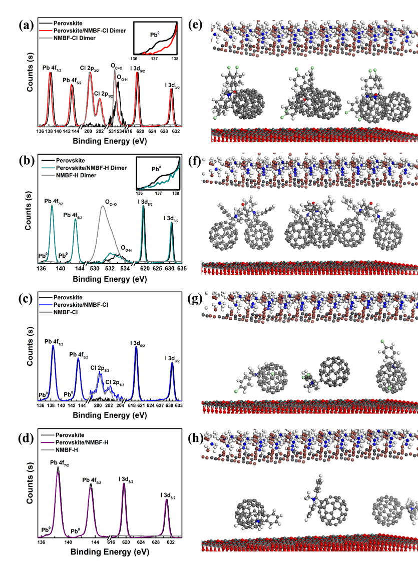 ▲Figure 3. XPS spectra of pristine perovskite, fullerene molecules and perovskite/fullerene bilayers: (a) NMBF-Cl dimer, (b) NMBF-H dimer, (c) NMBF-Cl and (d) NMBF-H. Simulated interactions at the perovskite/SnO2 interfaces with the presence of (e) NMBF-Cl dimer, (f) NMBF-H dimer, (g) NMBF-Cl and (h) NMBF-H at the interface. The simulations employ SnO2 (110) surfaces with Sn and O terminals and MAPbI3 (110) surfaces with Pb and I terminals.