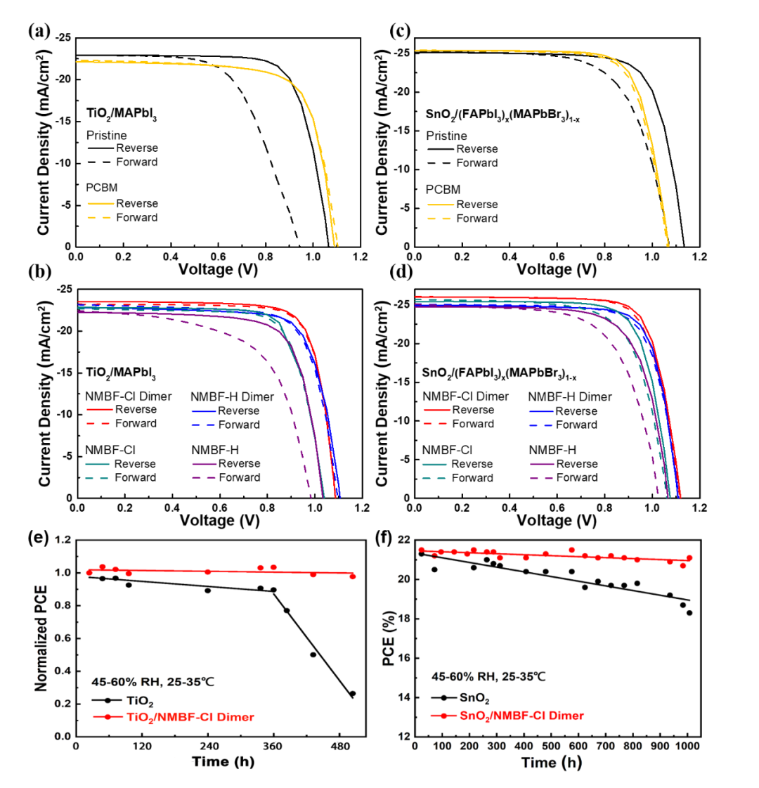 ▲Figure 2. Current density–voltage (J–V) curves of (a) TiO2/MAPbI3-based PSCs with PCBM or without any interfacial materials; (b) J-V curves of TiO2/NMBF-X monomers and dimers/MAPbI3-based PSCs; (c) J-V curves of SnO2/(FAPbI3)x(MAPbBr3)1-x with PCBM or without any interfacial materials; (d) J-V curves of SnO2/NMBF-x monomers and dimers/(FAPbI3)x(MAPbBr3)1-x-based PSCs.