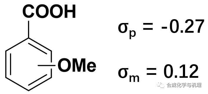 因為取代基常數(shù)代表的是對于負電荷的穩(wěn)定性,所以吸電基的取代基常數(shù)是正的,供電基的取代基常數(shù)是負的。一般來說取代基常數(shù)的正負與位置無關(guān),但有一個例外甲氧基的對位取代基常數(shù)是負的,而間位取代基常數(shù)是正的。這說明甲氧基在對位的時候是供電基,而在間位的時候更多的表現(xiàn)出吸電基的特性。為什么?