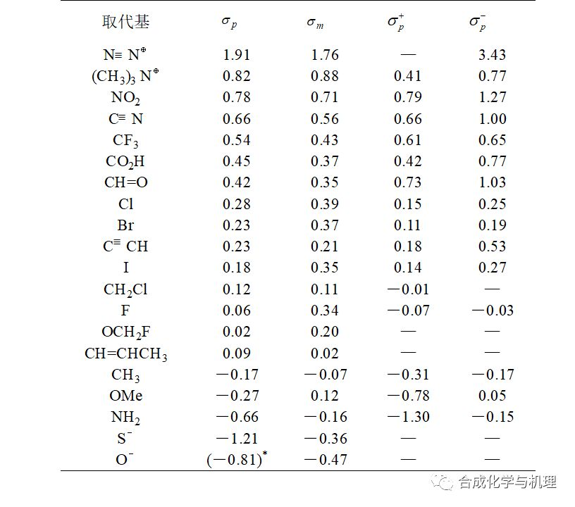 取代基常數(shù)的大小不僅與取代基的種類有關(guān),還與取代基在苯環(huán)上所處的位置有關(guān),而與反應物中除了取代基外的其它部分無關(guān),與反應類型和反應進行的條件也沒有關(guān)系。由于對位和間位苯甲酸的離解常數(shù)不同,每一取代基有兩個取代基常數(shù),即間位取代基常數(shù)和對位取代基常數(shù)。常見取代基的取代基常數(shù)列入下表中。