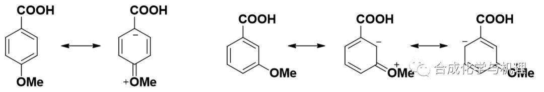 利用共振理論可以很好的解釋這個問題。如下圖所示,當甲氧基在對位時,其負電荷可以通過共軛作用有效傳遞給羧基,因此對位取代基常數(shù)σp是正的。而當甲氧基在間位時負電荷無法通過共軛作用到達間位,由于氧原子電負性較大,此時誘導效應起了主要的作用,因此間位取代基常數(shù)σm是負的。