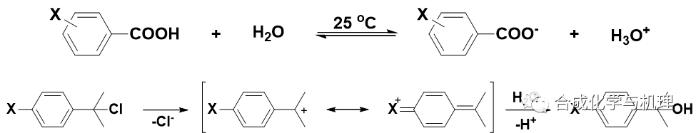 最初對σx的定義是建立在取代基效應對取代苯甲酸在25 ℃水溶液中電離反應的影響之上的,對于這些反應,取代基與反應中心不存在直接的共軛作用。有些發(fā)生在芳環(huán)支鏈或芳環(huán)上的反應,取代基與反應中心存在直接的共軛效應,例如取代苯基異丙基氯的水解反應。對于這些反應,反應速率的對數(shù)對s作圖不能得到好的線性關(guān)系,有必要定義一組新的取代基常數(shù)。