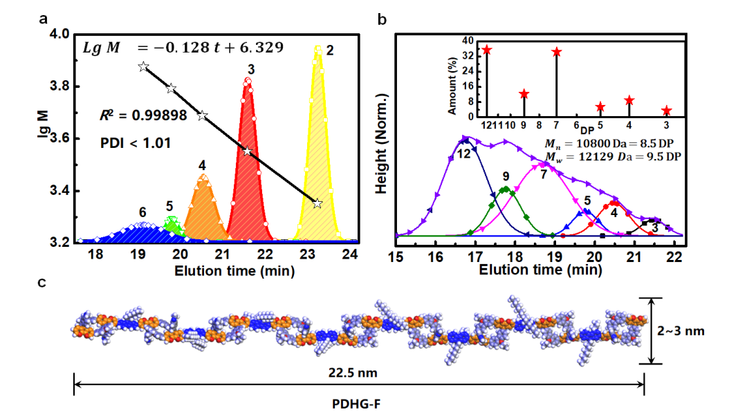 值得一提的是,所合成的聚手畫手格表現(xiàn)出了有機納米聚合物關(guān)鍵特征,這對該領(lǐng)域來說將是具有里程碑意義的。高分子物理研究表明,作為meso選擇性的格基納米聚合物(長度達20~30 nm,圖3),這類環(huán)鏈交替的主鏈結(jié)構(gòu)具有1.651的Mark-Houwink指數(shù)與流體力學(xué)半徑Rh~M1.13的依賴關(guān)系,證明了聚手畫手格鏈表現(xiàn)出與眾不同的剛性,預(yù)示了納米聚合物特征。此外,通過分子動力學(xué)模擬表明meso構(gòu)型的聚格鏈即使在塌陷狀態(tài)下仍然具有高度各向異性的棒狀骨架,而且表現(xiàn)出比外消旋體(rac)構(gòu)型的聚格主鏈更強的抗塌陷能力。有機納米聚合物立體規(guī)整性控制的重大突破正逢斯陶丁格(Hermann Staudinger)提出了高分子科學(xué)概念100周年,團隊心存崇敬也借用此文來紀(jì)念高分子科學(xué)誕生以及這位人類偉大的科學(xué)家,相信團隊“不忘初心,牢記使命”,開創(chuàng)的有機納米聚合物方向?qū)㈤_啟高分子科學(xué)的新篇章。
