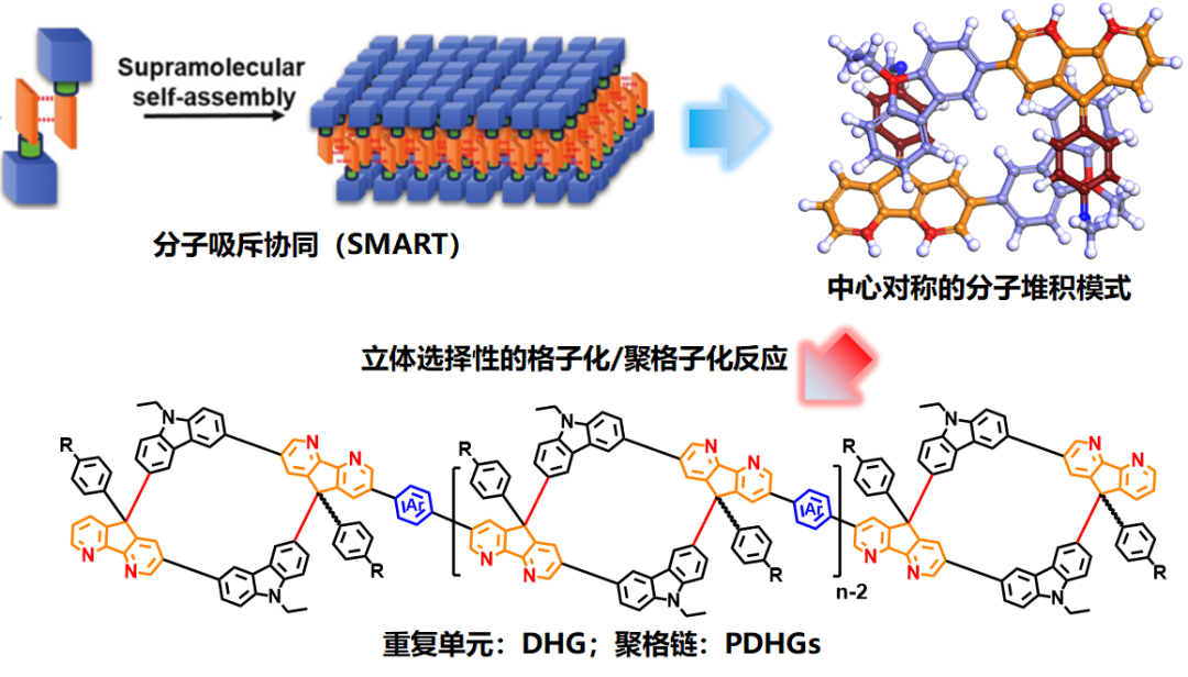 針對此問題,解令海教授與黃維院士從“分子吸斥協(xié)同理論(SMART)”出發(fā)(Small 2018, 14, 1703151, back cover, video abstract),設(shè)計了相應(yīng)的A2B2型合成子(圖2),利用電子給受體之間的π-π堆積吸引力與質(zhì)子化氮雜芴超親電體的電荷排斥力,調(diào)控出反平行與中心對稱的分子排列模式,從而利用了動力學(xué)克服了傅克反應(yīng)過程中熱力學(xué)平衡的干擾,實現(xiàn)了在格子化與聚格子化反應(yīng)中內(nèi)消旋體(meso)的選擇性。由于A1B1合成子二聚格子化所形成的缺角格與1948年荷蘭版畫大師摩里茨·科奈里斯·埃舍爾創(chuàng)作的《手畫手》存在一種對應(yīng)關(guān)系,最終我們將這一類有機納米聚合物命名為聚手畫手格(Poly(Drawing Hands-type Gridarene), PDHG),該定義也代表了NGA作為納米連接(Nanolinkage)的喻義,期望未來手畫手格成為一種真正有效地納米互聯(lián)的化學(xué)方式。