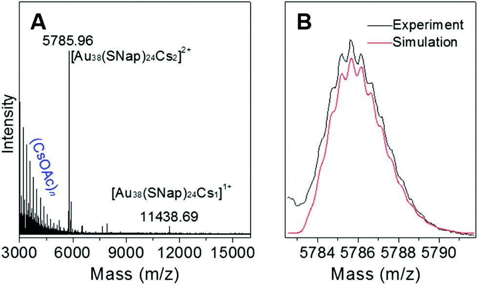 十分有意思的是,當起始原料中加入少量吡啶而其它條件保持不變時,最后得到的團簇樣品并非 Au36(Snap)24,而是一種具有與 Au38(PET)24 團簇的紫外可見光譜相類似的團簇樣品,如圖 2 所示,即團簇具有與 Au38(SNap)24 相同的金核結構。該團簇的 MALDI-MS 譜圖中只出現了一個信號峰,m/z = 11146.8 Da,與 Au38(Snap)24 激光轟擊失去一個萘硫酚配體后的 Au38(Snap)23 團簇的理論值 11147.0 Da 基本一致。此外,當將樣品團簇溶液注入到 ESI-MS 時,無論在陰離子還是陽離子模式下都不能得到任何信號峰,說明該團簇應該是電中性的。輔以 CsOAc 時則得到了如圖 3 所示的質譜圖,并且對團簇的同位素峰進行了分析擬合,二者正好匹配,可見該團簇的分子式為 Au38(SNap)24。因此,當向 80℃ 的 Au144(SR)60 團簇甲苯溶液中加入萘硫酚和吡啶時, Au144(SR)60 團簇可以轉化成單一分散的 Au38(SNap)24 團簇。