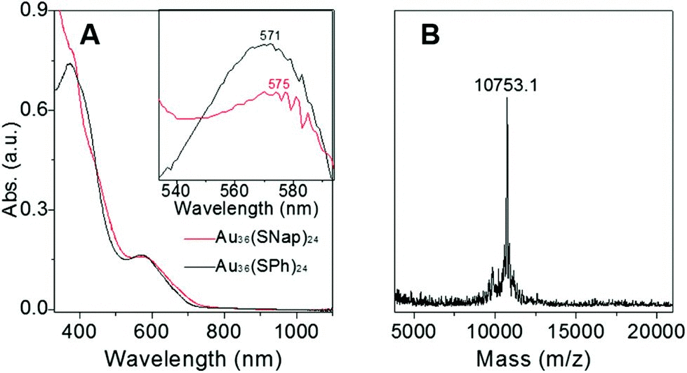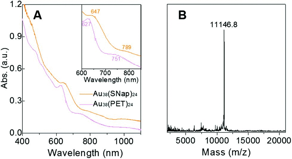 ▲ | 圖 1. Au36(SNap)24 團簇的 UV-vis 譜圖和 MALDI-MS 譜圖。 |