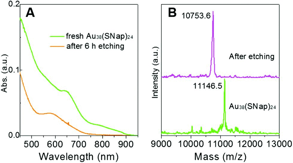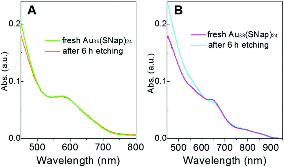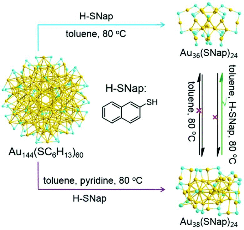 簡言之,Au144(SR)60、Au38(Snap)24 以及 Au36(SNap)24 三者間的轉化關系如下:在 80℃,當有過量萘硫酚存在時 Au144(SR)60 轉化成 Au36(Snap)24;當有過量萘硫酚和必定同時存在時 Au144(SR)60 則會轉化成 Au38(Snap)24;Au38(SNap)24 在有兩倍當量萘硫酚存在時則會轉化成 Au36(SNap)24。