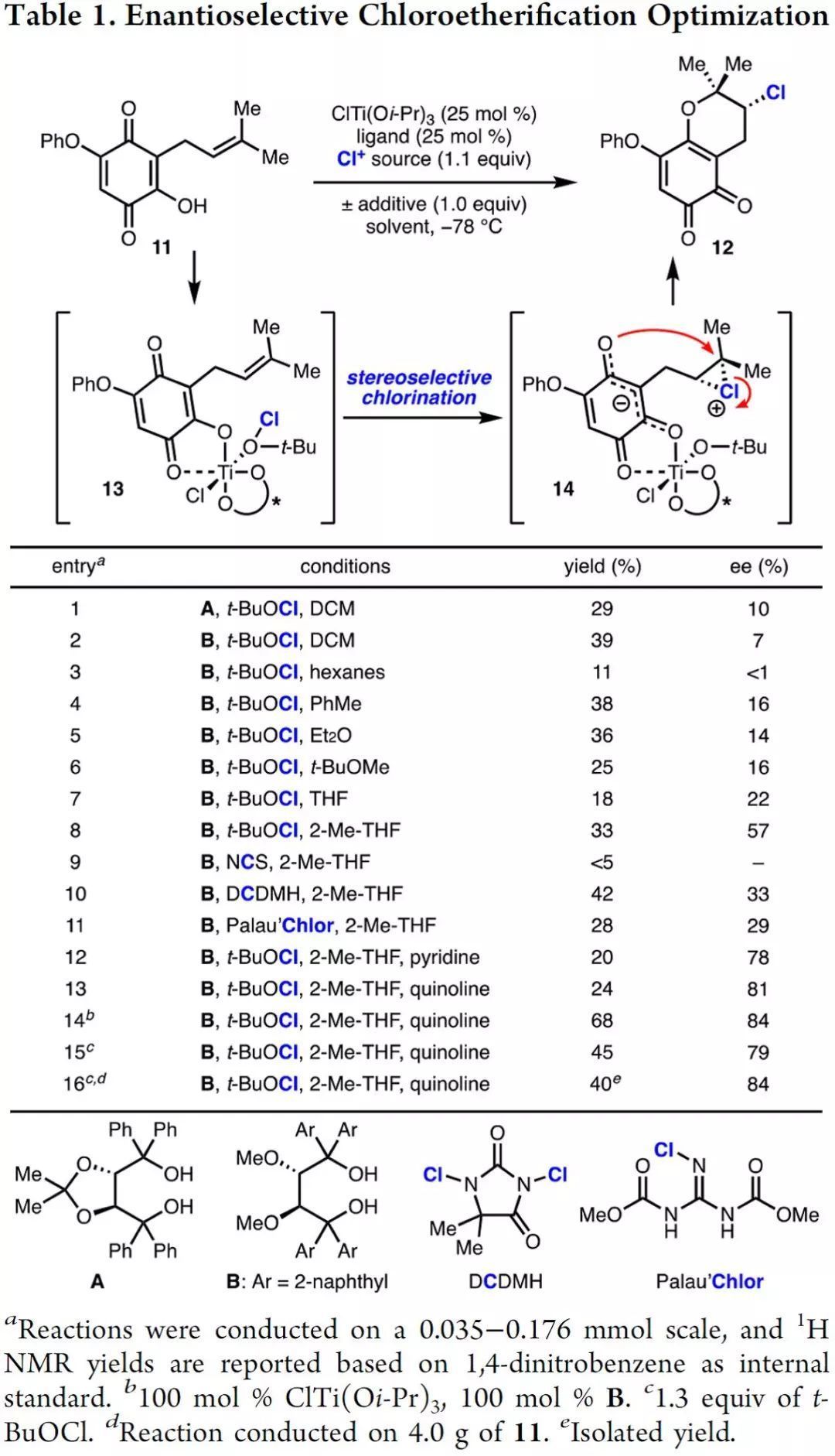 合成路線始于對映體富集的氯代環7和9的制備。由于7和9的不對稱合成方法有限,因此作者首先致力于開發新型對映選擇性氯醚化方法(Table 1)。在對可能的底物結構和手性催化劑進行了大量研究后,作者發現在TADDOL配位的鈦配合物和次氯酸叔丁酯作用下,異戊烯基羥基醌11能以中等收率、10%的ee值得到氯代環化的鄰醌12(entry 1)。反應最初形成中間體13,因為配位飽和的八面體鈦配合物對于高選擇性是必需的。然后13通過立體選擇性氯化反應轉化為14。12可能是通過14中的羰基氧捕獲氯鎓鹽產生的。隨后,作者經條件優化發現,以改良的TADDOL(B)作配體、喹啉作堿、t-BuOCl作氯源、2-甲基四氫呋喃作溶劑,氯環化反應在4克級規模下能以40%的分離產率得到目標產物13,且ee值較高(entry 16)。