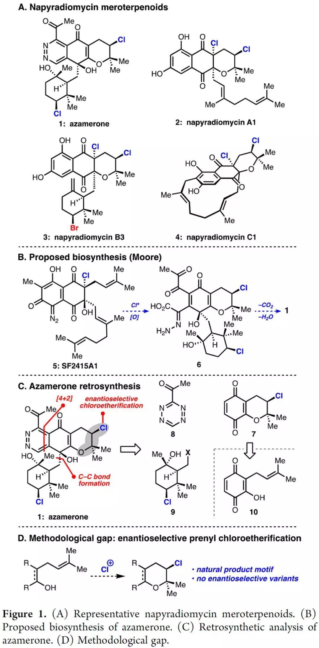 Napyradiomycins是從陸地和海洋放線菌中分離出的一類鹵化雜萜類化合物。其可以有效抑制胃(H+-K+)-ATP酶和革蘭氏陽性菌,并且對非甾體雌激素具有拮抗作用,還具有癌細胞毒性等。在眾多napyradiomycins衍生物中,目前僅有napyradiomycin A1的全合成被報道(Figure 1A)。Azamerone是結構獨特的napyradiomycins衍生物,它是唯一含有酞嗪酮的天然產物。Moore推測其氮雜環是由SF2415A1(5)經中間體6的氧化重排產生的(Figure 1B)。Azamerone的高度氧化結構、雜原子多樣性、兩個手性叔醇和兩個不同的含氯手性中心使得其合成極具挑戰性。近日,美國斯坦福大學Noah Z. Burns教授課題組實現了二氯化雜萜烯azamerone的簡潔全合成。相關文章發表在J. Am. Chem. Soc.上(DOI: 10.1021/jacs.8b12566)。