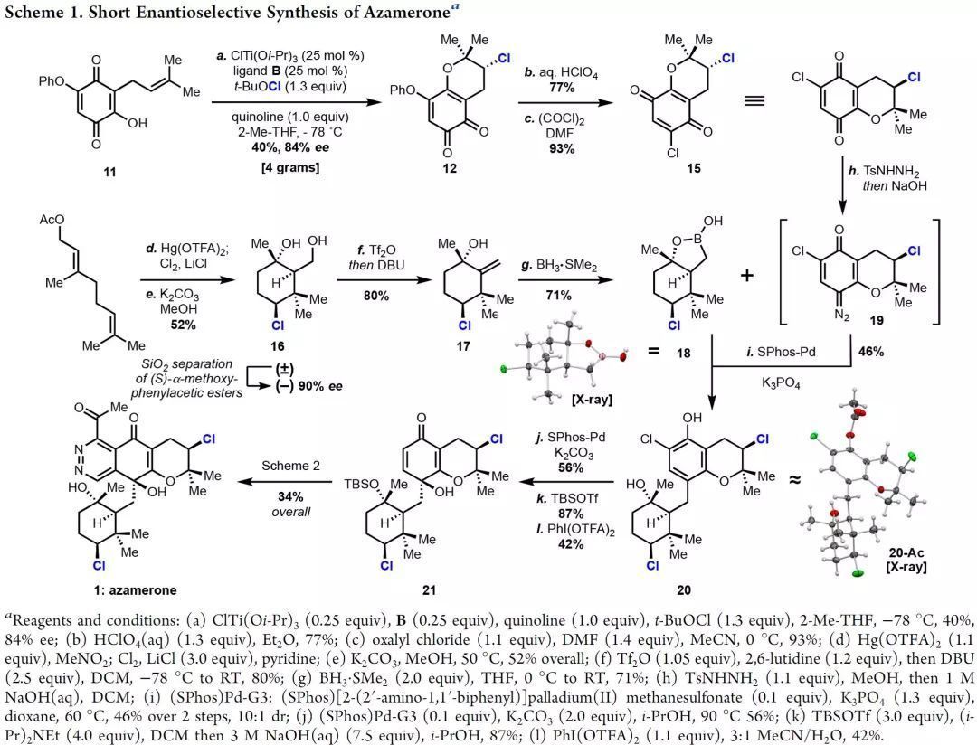 得到對映選擇性氯醚化的最優條件后,作者便開始進行azamerone的合成(Scheme 1)。11可由市售原料經兩步反應制備,其在優化的環化條件下得到12。12在酸性水溶液中水解并異構化成中間體2-羥基對醌,接著在草酰氯和DMF條件下順利轉化為相應的鄰氯對醌15。為合成azamerone中的氯代環己烷,作者參照Gulder和Snyder課題組的研究,利用Hg(OTFA)2參與的鹵代多烯環化兩步法得到外消旋氯代環16。隨后作者在手性拆分研究中發現,16的(S)-α-甲氧基苯乙酸酯可以在硅膠上實現非對映異構體的色譜分離。該方法可以克級規模分離出16的異構體。16在三氟甲磺酸酐和DBU作用下進行化學選擇性脫水得到烯烴17,其可以較高的收率和非對映選擇性進行硼氫化,形成硼酸半酯18。