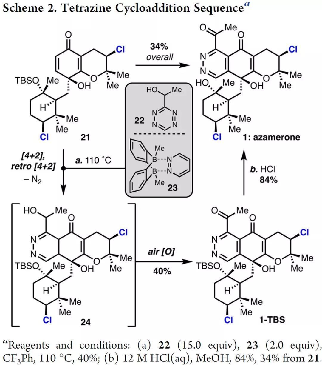受Boger的啟發(Tetrahedron 1983, 39, 2869),作者設想21能與官能化的四嗪經[4+2]環加成快速轉化為azamerone。在研究過程中,Wegner課題組報道了雙硼配合物23催化四嗪與萘醌的環加成反應。令人高興的是,作者將23應用于本研究中,順利得到硅烷基保護的azamerone(1-TBS)。該串聯反應可能是通過[4+2]環加成、逆[4+2]環加成釋放氮氣(形成二氫噠嗪24)以及原位氧化芳構化和芐醇氧化進行的。隨后,1-TBS在鹽酸作用下脫去硅烷保護基從而得到azamerone,總收率為34%。