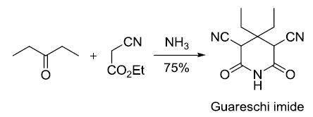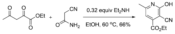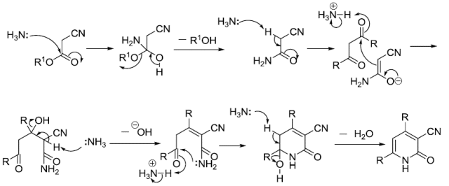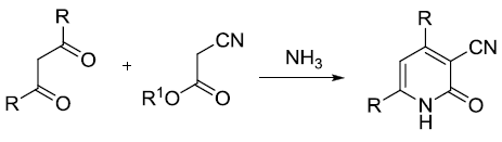 氰基乙酸和β-二酮在氨存在下縮合生成2-吡啶酮。