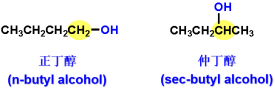 1 醇的結構 醇是羥基連在飽和sp3碳原子上的化合物。 醇可以看成是水分子的一個氫原子被烴基取代所形成的有機衍生物。 醇的官能團是羥基——-OH 醇分子中氧原子采取不等性sp3雜化。具有四面體結構: 由于氧的電負性大于碳,醇分子中的C-O鍵是極性鍵,ROH是極性分子。 不穩定的醇 當OH與雙鍵直接相連,或同碳上連有兩個OH、或同時連有OH基和-X時,化合物不穩定,容易變成羰基化合物。 2 醇的分類 (1)根據官能團所連羥基的類型 (2)根據羥基結構 (3)根虎羥基數目 3 醇的命名 (1)普通命名法 將相應烷烴名稱中的烷→醇 有些用俗名:木醇、甘油、肉桂醇。 (2)系統命名法 以醇為母體。以含有-OH的最長碳鏈為主鏈,從靠近-OH的一端開始編號,把支鏈看成取代基。 →不飽和醇命名時應選擇連有羥基和不飽和鍵在內的最長碳鏈作主鏈,從靠近羥基一端開始編號。 →命名芳香醇時,可將芳基作為取代基加以命名。 →多元醇的命名應選擇包含盡量多的羥基碳鏈做主鏈。依羥基的數目稱二醇、三醇等。 4 醇的物理性質 (1)沸點:與相對分子質量相近的其他有機物相比,醇的沸點較高。 ROH分子間可形成氫鍵! (2)溶解度: C3以下醇與水混溶,C4以上隨C數↑,溶解度↓ 原因:a. 醇與水可形成分子間氫鍵: b. 隨C數↑,R在ROH中比例↑,而R一般是疏水的。 (3)光譜性質 a.IR譜 b.HNMR譜 醇羥基的δ≈0.5-6.0,變化較大,且峰形較寬。 加入重水羥基峰消失。