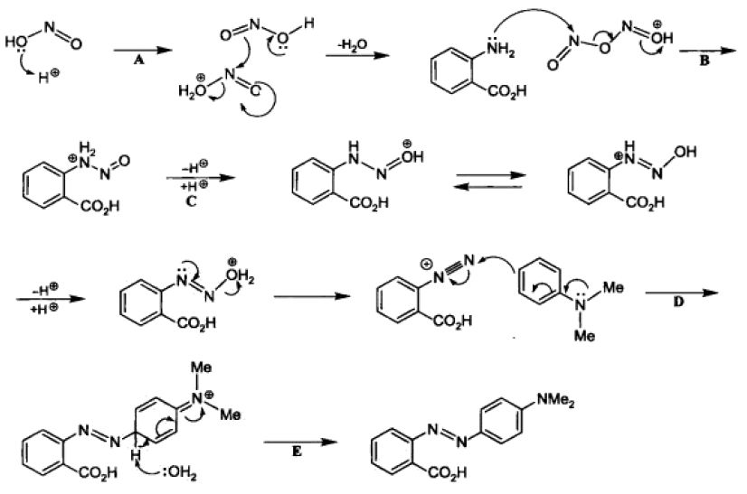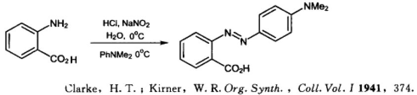 反應說明:該反應是苯胺在亞硝酸的作用下轉變為重氮鹽,然后與N,N-二甲基苯胺反應生成偶氮苯的典型反應