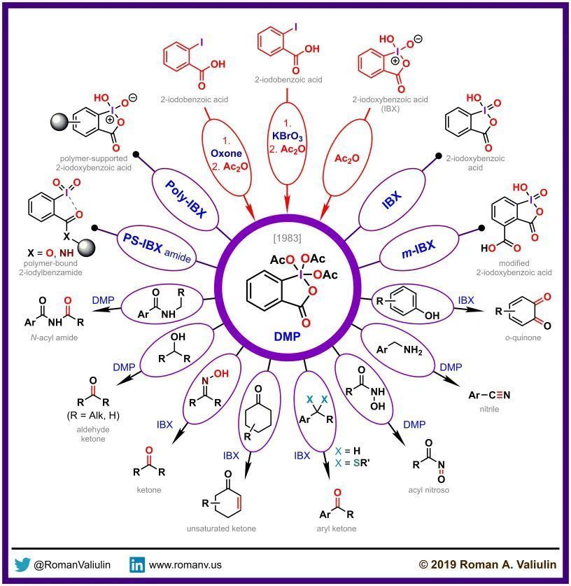【制備和商品】該試劑在國際大型化學試劑公司有銷售。實驗室以鄰碘苯甲酸為原料,通過兩步反應來合成。由于合成過程中存在有爆炸的可能性,因此最好嚴格按照最近Org. Synth.[1]刊出的標準實驗步驟來進行操作。