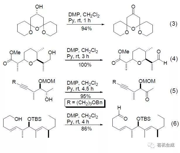 但是,對帶有酸敏性官能團的醇化合物而言,在DMP 的氧化反應中加入適量的吡啶來中和生成的乙酸會明顯地提高反應產物的產率。在該條件下,酸敏性羥基保護基、縮醛、雙鍵、炔鍵和酯基官能團均不受到任何影響[6~10]。在文獻[6]報道的一個天然產物的全合成中,DMP 對醇的氧化反應被應用了三次(式3~式6)[4,5]。